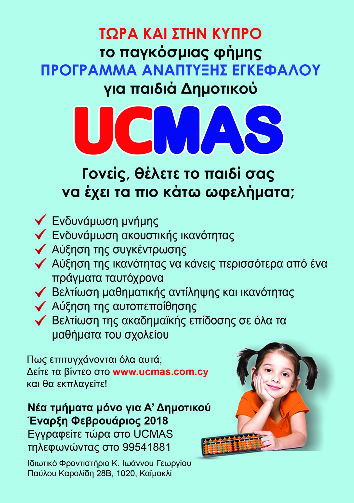 Γονείς, κάντε τα παιδάκια σας εξυπνότερα και χαρισματικά με το Πρόγραμμα Ανάπτυξης Εγκεφάλου για Παιδιά Δημοτικού UCMAS. Νέα τμήματα για παιδάκια Α’ Δημοτικού ξεκινούν την πρώτη βδομάδα Φεβρουαρίου.